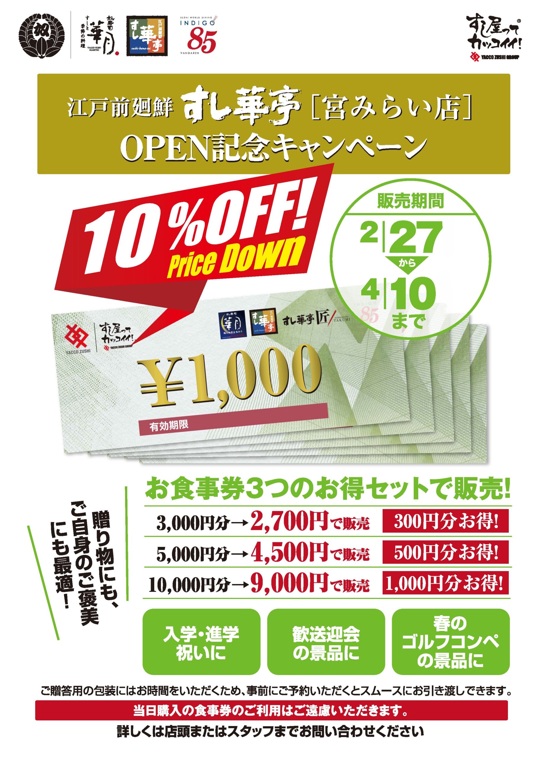 すし華亭 宮みらい店オープン記念! 奴寿司食事券10%オフで販売中