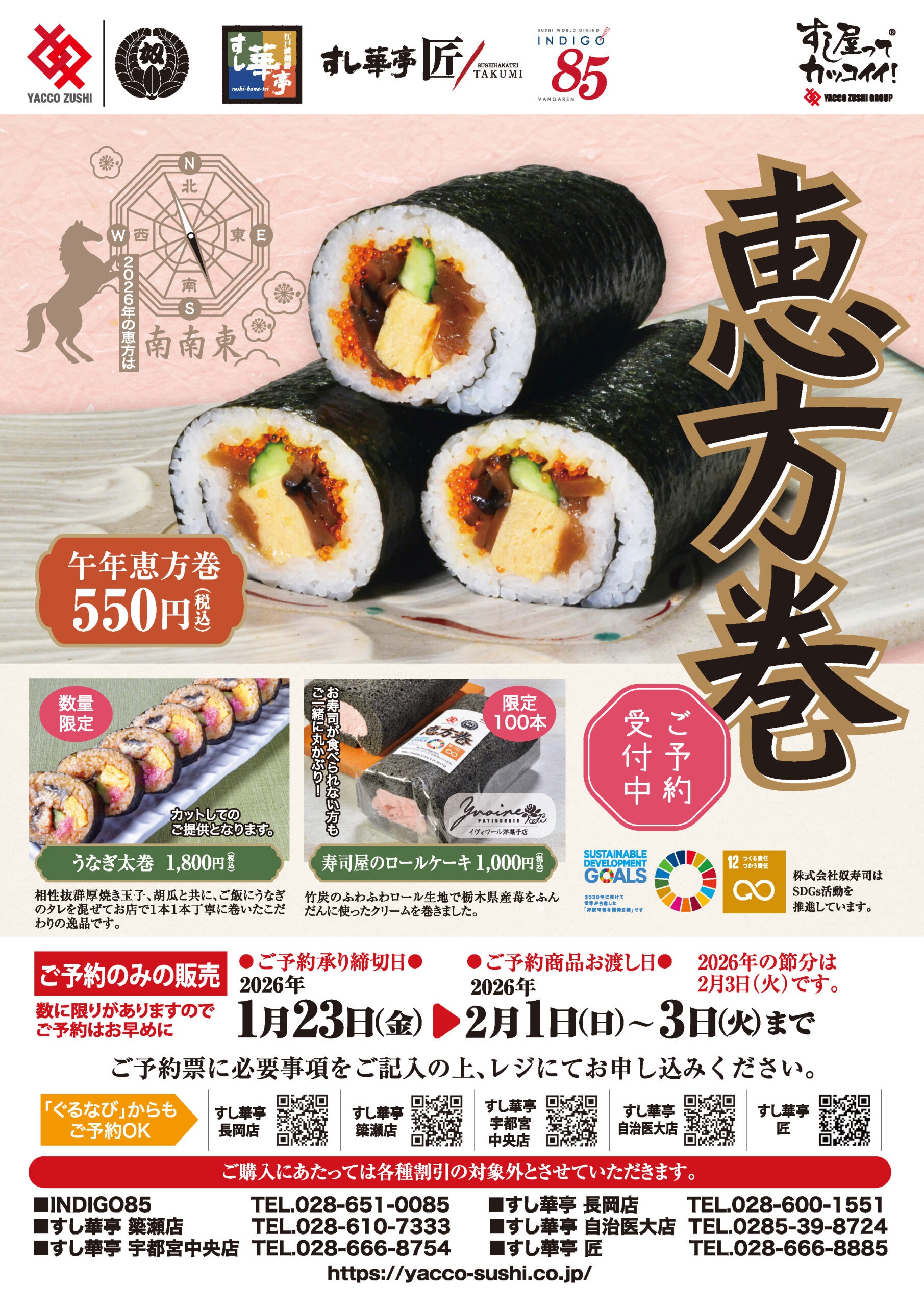 2025年12月12日 2026年 午年恵方巻 ご予約承り中!! 毎年大好評のすし華亭の恵方巻のご予約受付を開始いたしました。 恵方巻は節分に恵方を向いて食べると運を呼び込むとされている縁起ものです。 2026年の恵方は南南東! すし華亭の職人が、一本一本心を込めて巻き上げる恵方巻をぜひお召し上がりください。 前の記事 年末年始の営業時間のお知らせ 次の記事 【奴寿司 華月】 2026年大名恵方巻のご予約承り中!